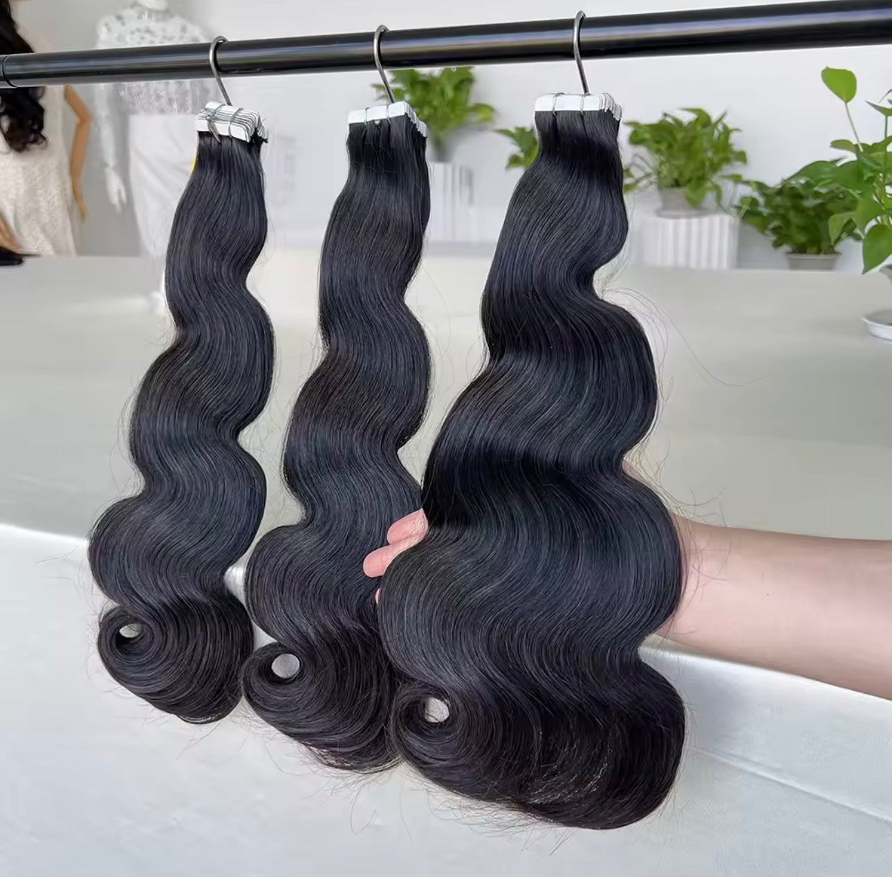 Sistema adhesivo: tiras “tape‐in” (adhesivas) que se aplican plano sobre la raíz, para un acabado prácticamente invisible.